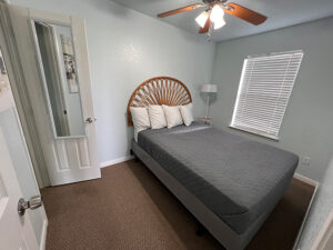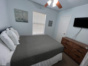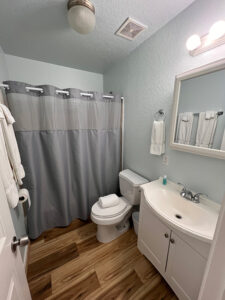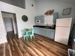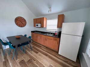 Our large cabins feature a full kitchen with new appliances, living area, bedroom with full size bed, closet, bathroom and shower and small front porch. These cabins are furnished with towels and linens included, flat screen tvs and high speed wi-fi. Perfect for workamping, tiny home lifestyle enthusiasts or a weekend getaway! Please find example photos from a few of our large cabins below.