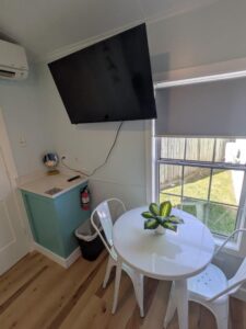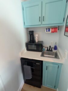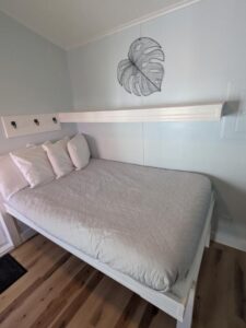 Our small cabins feature a kitchenette with new appliances, full size bed, desk, bathroom and shower. These cabins are furnished with towels and linens included, a flat screen tv, and high speed wi-fi. Please find example photos of our small sized cabins below – duplex and single.
